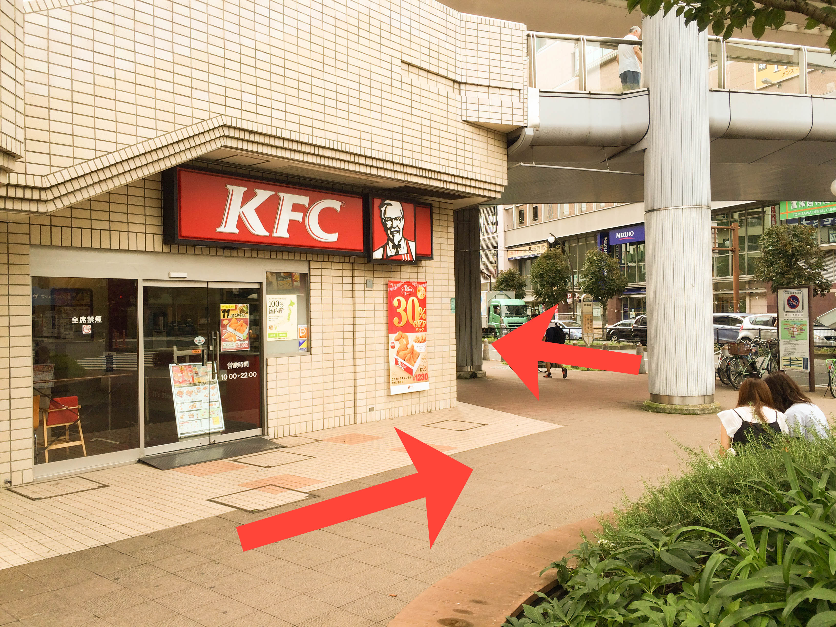 大きな道路(川崎街道)に当たったら、道路を渡らずにケンタッキーの角を左に曲がります。